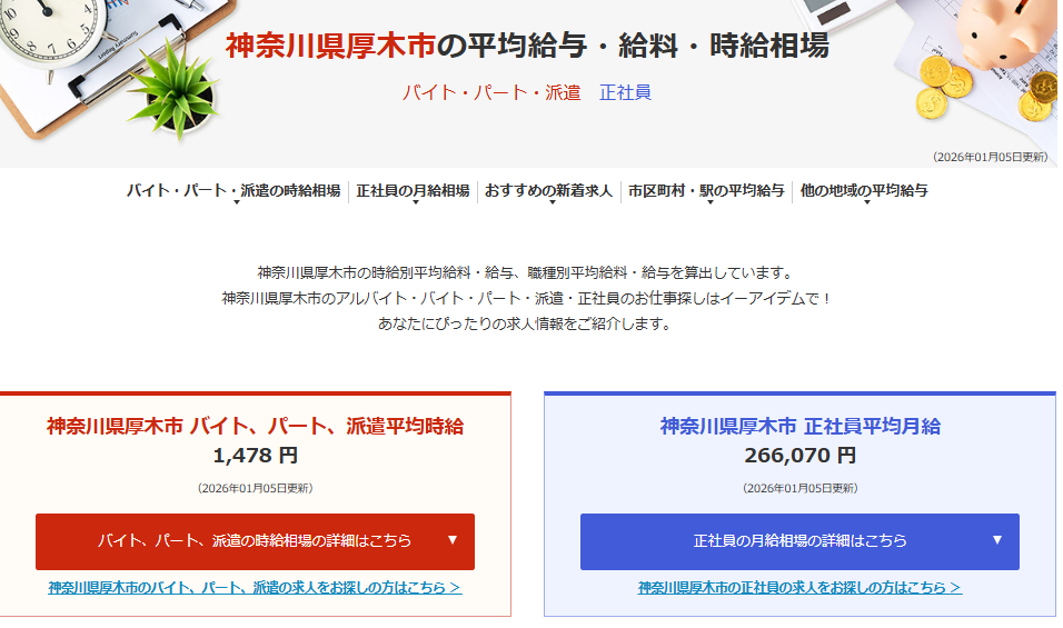 引用:神奈川県厚木市の平均給与・給料・月給・時給相場 | イーアイデム