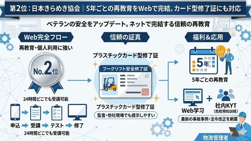 | 日本きらめき協会 | 安全衛生教育・再教育 | 5年ごとの更新講習に特化しており、カード型の修了証発行にも対応。 | フォークリフト フォークリフト再教育5年の管理を効率化したい企業向け。 |