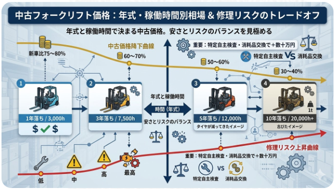 リスクの具体的な評価表は、詳細は「[年式・稼働時間別で見る中古フォークリフト購入のリスク評価(準備中)]」で解説します。